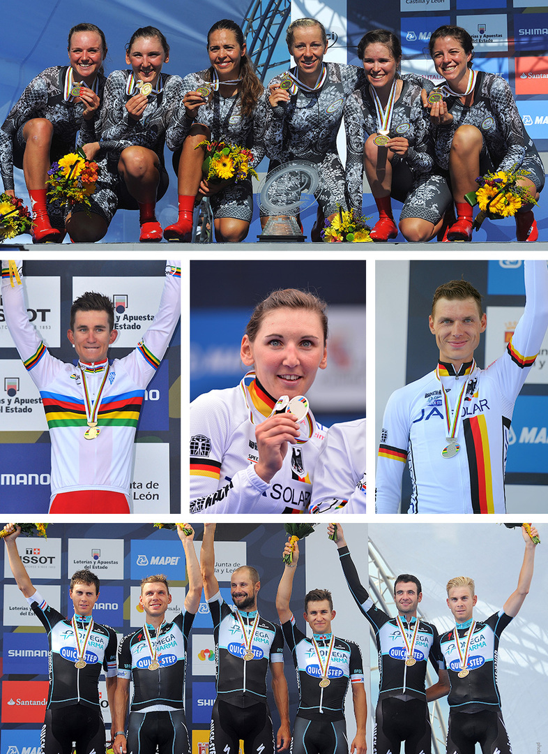 Oro del team Specialized-Lululemon women nella prova time trial donne. Bronzo del team Omega Pharma-Quick Step nella competizione a squadre in campo maschile. Medaglia d’argento di Lisa Brennauer (Specialized-Lululemon) nella crono riservata alle donne elite. The last but not least, come si dice, Michal Kwiatkowski che vince la prova dei pro nella giornata di Domenica 28 Settembre.