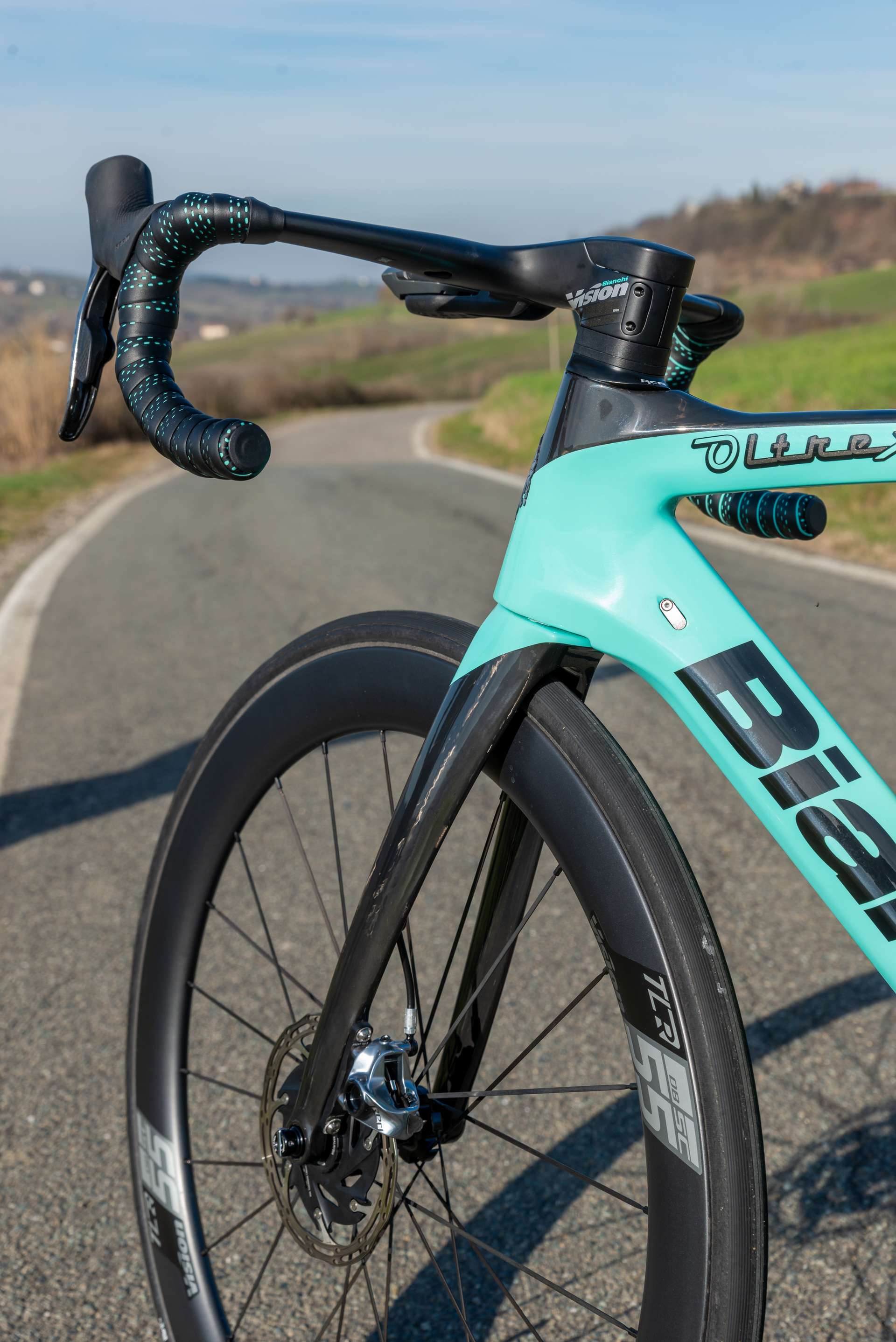 L’allestimento della bici test è al top nella lista dei desideri di ogni amante della bici. La trasmissione Red AXS di Sram ma anche molto di casa Vision. Le ruote da 55 mm sono tubeless ready e il manubrio integrato Metron 5D con tecnologia ACR è davvero funzionale (oltre che bello da vedere). Bianchi Oltre XR4 Disc è disponibile in sette differenti taglie (47, 50, 53, 55, 57, 59 e 61), due colorazioni da catalogo, oltre alla possibilità di personalizzare con Tavolozza.