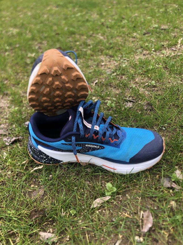 Con la Catamount 1 l’unboxing era stato vero amore a prima vista. Tutta bianca, con l’intersuola bianco-azzurro pallido, una scarpa da trail che sembrava una scarpa da mettere di sera con l’abito, una figata! E poi, tutta bianca per fare trail! Non vedevo l’ora di sporcarla per bene e farla funzionare al meglio tra il terriccio marrone dei sentieri fuori Milano e le “salite bastarde drittoxdritto” della Montagnetta di San Siro. Un test che alla fine si era rivelato un vero successo, sia per me che per la versione d’esordio della Catamount, quella bianca appunto! La Catamount 2 è invece molto diversa, molto meno minimale della versione precedente, con particolari di rinforzo laterali ben in evidenza che disegnano geometrie un po’ futuristiche sulla parte bassa del fianco della scarpa. Giochi di blu e azzurro ton sur ton della tomaia che ne evidenziano lo stile da racer, accentuato dai particolari di rinforzo del puntale in gomma e del fregio Brooks ben in evidenza sul fianco. Si capisce che la Catamount 1 era solo stato un timido asssaggio, rispetto a questa nuova versione, molto più strutturata, con una spiccata indole trail. Onestamente la combinazione colori della versione di lancio Peacoat/Atomic Blue/Rooibos non è quella che preferisco, ma l’utente finale può sbizzarrirsi nel scegliere quella più congeniale tra 3 proposte differenti per l’uomo e 2 per la donna.