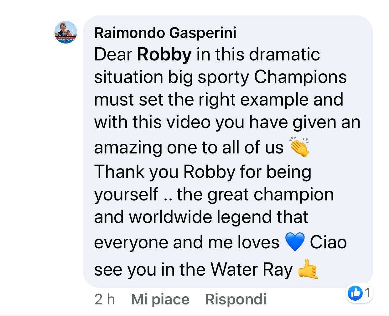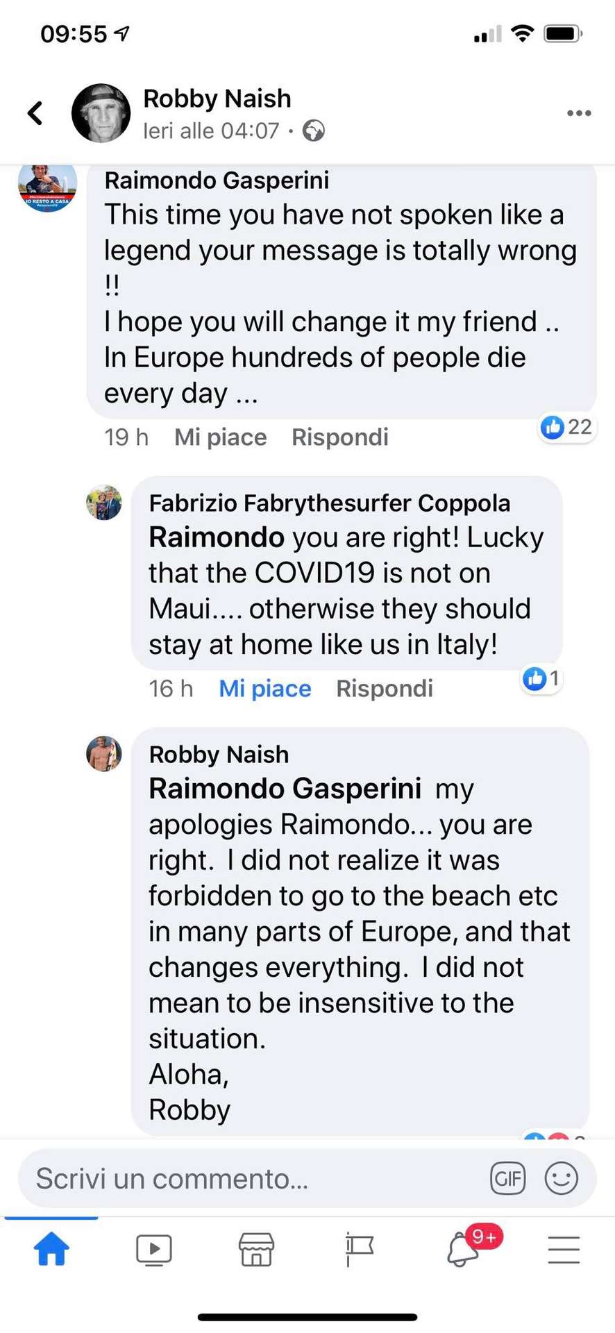 Forse Robby Naish non era ancora a conoscenza che le spiagge in Europa fossero chiuse alla pratica degli sport acquatici. Uno dei primi interventi per far comprendere meglio la difficile situazione attuale fra i vari commenti arrivati da mezza Europa anche quello del nostro Raimondo Gasperini, che grazie alla sua confidenza con lo Zio derivata da anni di conoscenza, anche a livello agonistico, gli ha fatto prontamente notare la “svista”.