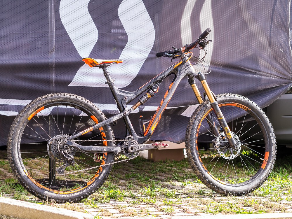 In pratica si tratta dell’evoluzione della Genius LT verso le sezioni “mid fat” per le gomme Schwalbe Nobby Nic Evo da 2,80”, con mescola differenziata tra anteriore e posteriore (TrailStar e PaceStar), montate su capaci cerchi Syncros TR1.5 Plus Tubeless Ready. Il montaggio presenta il meglio – o quasi – offerto dal mercato: forcella Fox 36 Factory Kashima FIT4 da 160 mm; ammortizzatore Fox Nude Kashima Evol custom per Scott con tre posizioni tra Lockout, Traction (110 mm) e Descend (160 mm); trasmissione Sram X01 1x11v con guida catena; freni a disco Shimano XTR 203/180 mm; appoggi Syncros con telescopico Rock Shox Reverb Stealth da 150 mm (taglie M e L). Complice un rigido e leggero telaio con triangolo anteriore in fibra di carbonio e carro in alluminio, il peso della bici si attesta intorno ai 13 chili (dichiarato 12,7 kg, noi abbiamo provato una Large).