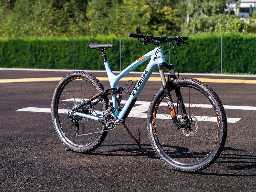 Noi abbiamo provato il media gamma 9.8, con uno spettacolare telaio in fibra di carbonio OCLV Mountain a parte i foderi bassi in alluminio. L’allestimento è ben congegnato: forcella Fox Float 34 Performance Fit4 da 120 mm con offset personalizzato G2 (51 mm); ammortizzatore Fox Float Evol Performance RE:activ custom per Trek (120 mm alla ruota posteriore); ruote DT Swiss E1900 con mozzi Boost110 e Boost148 all’anteriore e al posteriore; trasmissione Shimano XT M8000 2x11v; reggisella telescopico Rock Shox Reverb Stealth da 125 mm; appoggi Bontrager con manubrio low rise in carbonio; freni a disco Shimano XT M8000.